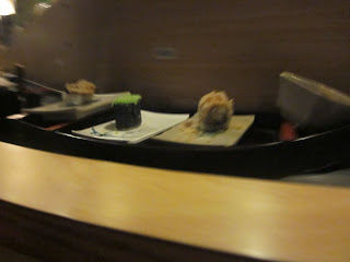 Ichiban, at 13th and Nicollet Mall in downtown Minneapolis, is one of my favorite places to get sushi in the Twin Cities. They have hibachi, where you have your own private chef who cooks food for you on a hibachi, a large griddle-type heating platter, with many theatrical tosses of cooking utensils. They also have a sushi bar, which is where I like to go, because it's a better value for the money, where you get all of the sushi, potstickers, miso soup, and green tea or orange ice cream you want for about $30. The sushi bar is round, with an open area in the middle, where the sushi chefs prepare the sushi, surrounded by a small waterway upon which plastic boats float. The sushi chefs put the prepared sushi, along with other side dishes, such as edamame, on the boats and you take what you want when the boats go by you. There is seating for about twenty people around the sushi bar, and the seating is first come, first served, so you can't make a reservation for it. If you come early, you usually don't have to wait, though. The sushi chefs prepare a wide variety of sushi, and oftentimes, you can request sushi if you want a certain type. When I went there with my friends last Saturday, they served everything from salmon sashimi (raw salmon on rice) to sweet potato tempura sashimi to sushi rolls with green fish eggs in them, along with more traditional sushi fare. I have been going there for about six or seven years and I think the quality of the fish they serve has improved in that time. I feel like it's a really fun place to go with friends, I always have a good time there eating delicious sushi. Unfortunately, the quality of the pictures isn't super great, the lighting in the restaurant is rather dim, so sorry about that.